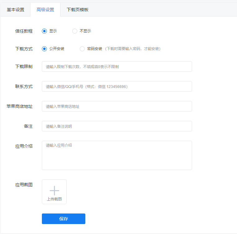 5. 苹果商店地址:如APP已经上架苹果商店,可以输入APP在苹果商店的地址,用户点击下载时,直接跳转到苹果商店
